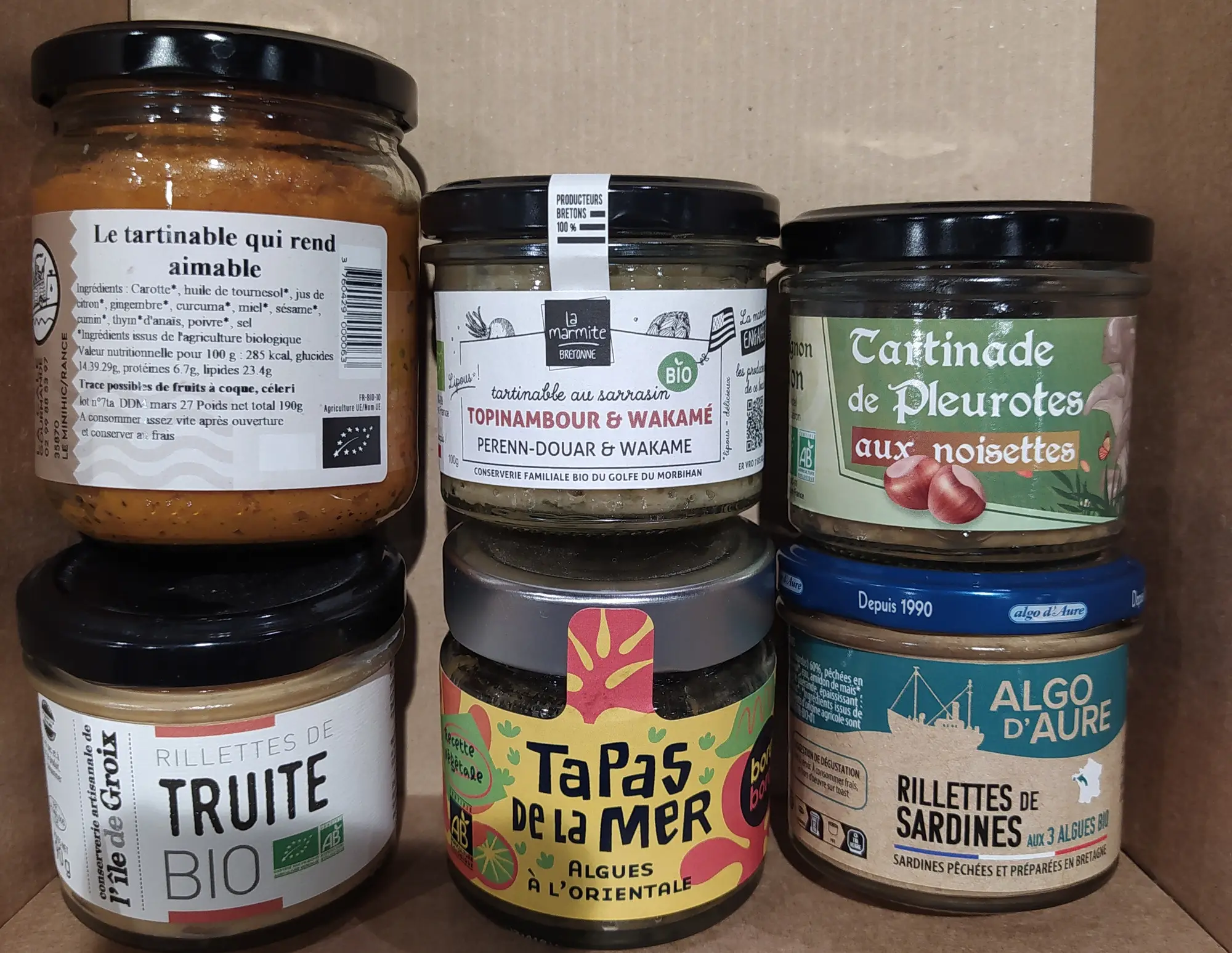 Des tartinades au poisson (truite, sardine, thon...) mais aussi végétales (topinambour et wakamé, pleurotes aux noisettes, algues à l'oriental, carottes et épices...)